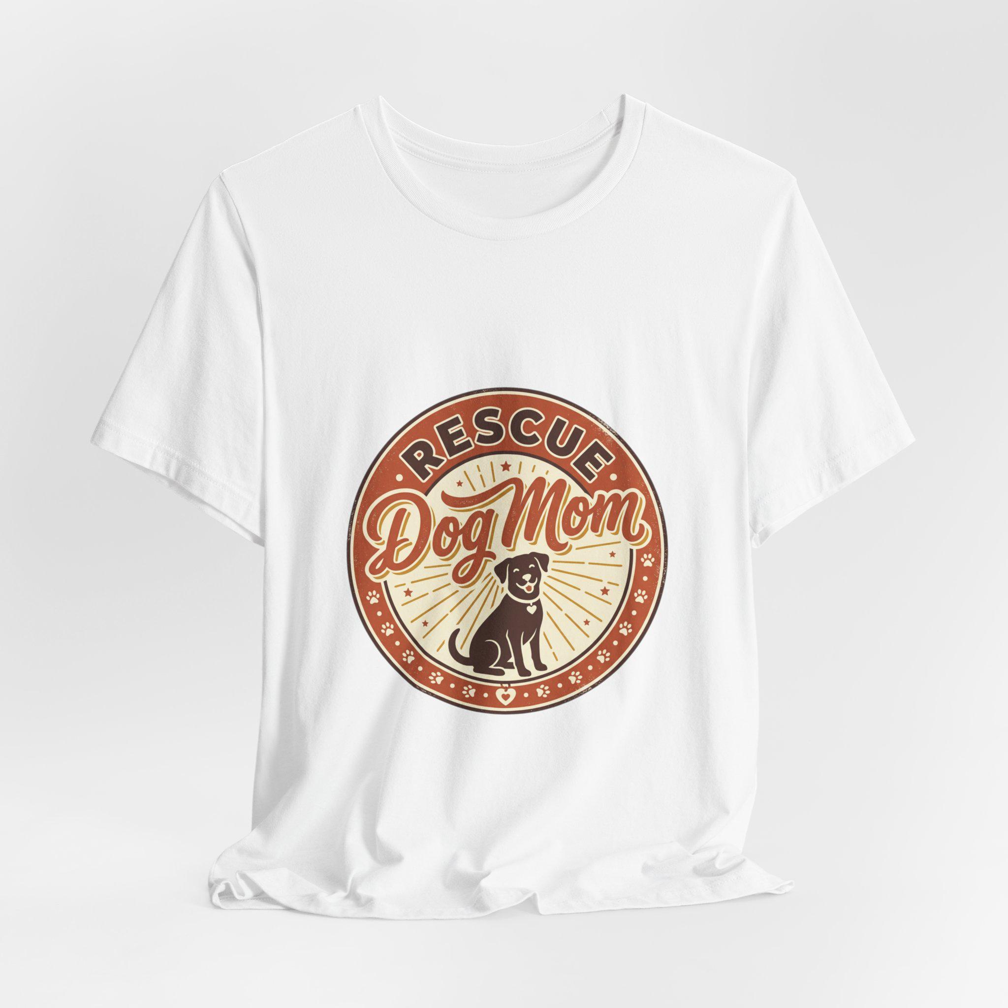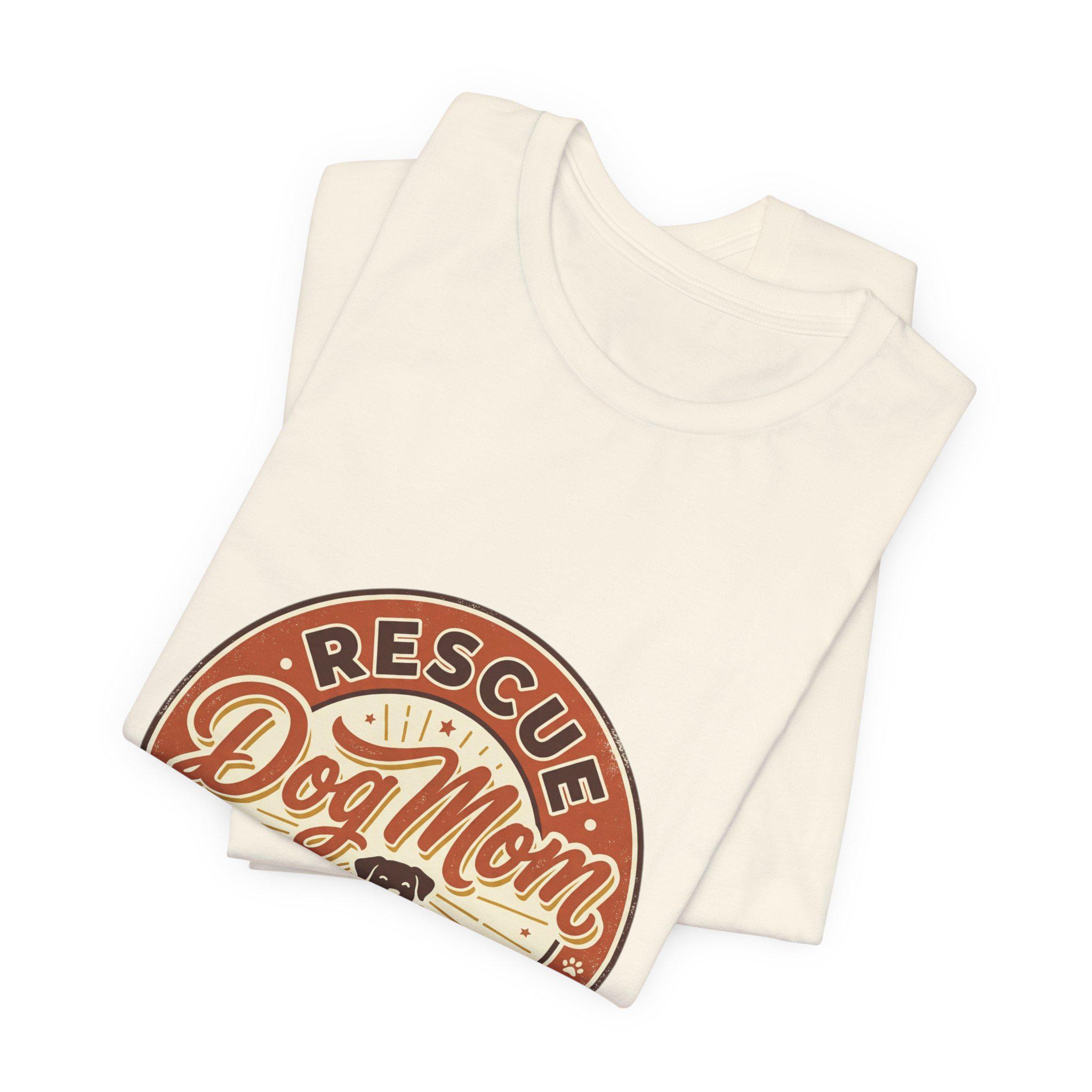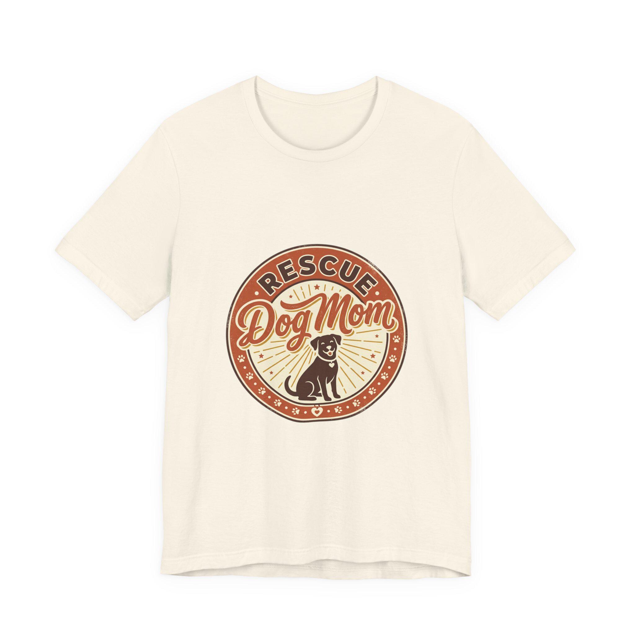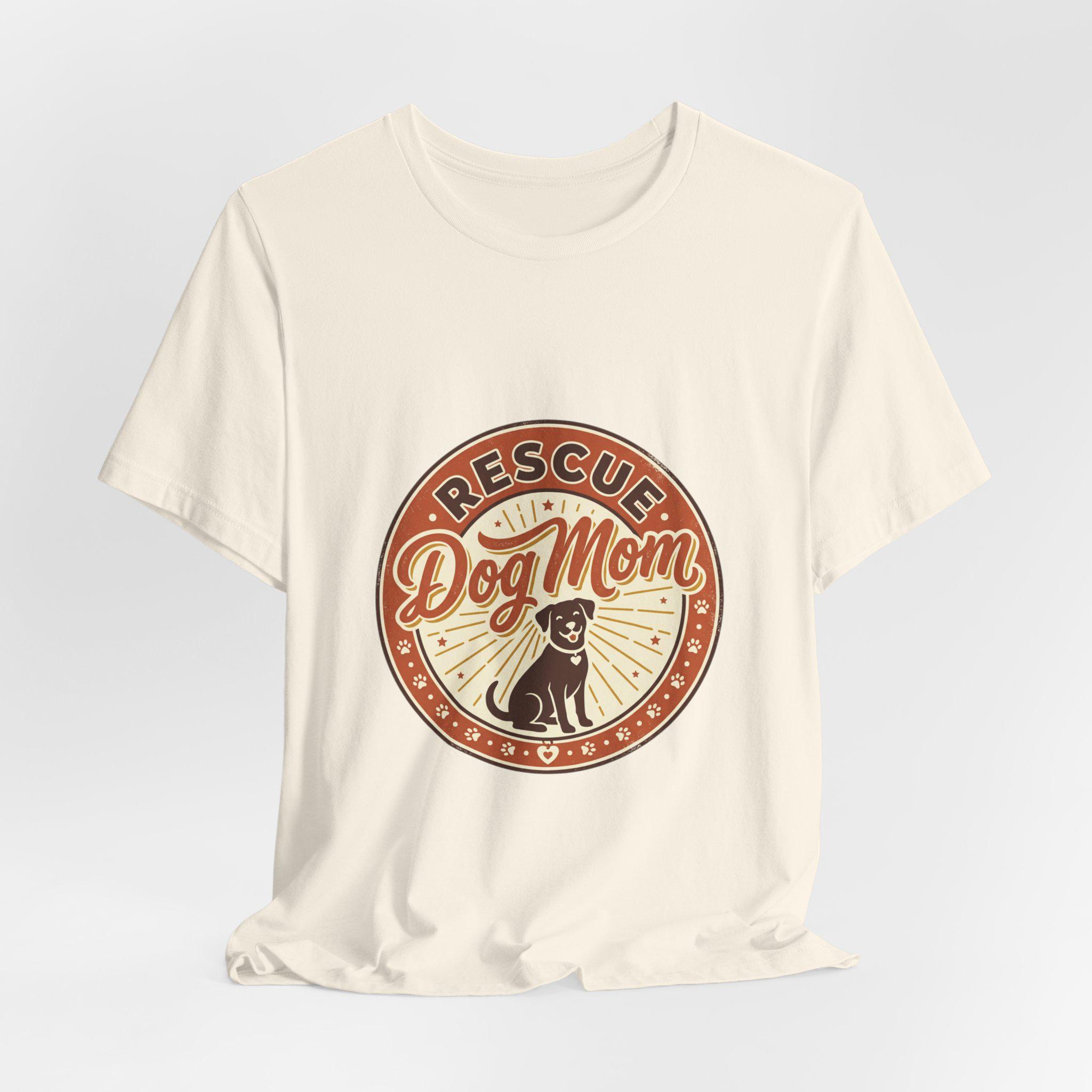 Rescue Dog Mom tee with a warm vintage badge-style illustration celebrating rescue pride. The front artwork pairs friendly script and a sunburst motif around a silhouette of a happy dog, using soft warm neutrals and a slightly distressed retro look that reads as affectionate and everyday wearable. It leans into the dog-mom identity trend—subtle, specific to rescue pride, and styled for casual layering or easy everyday wear.