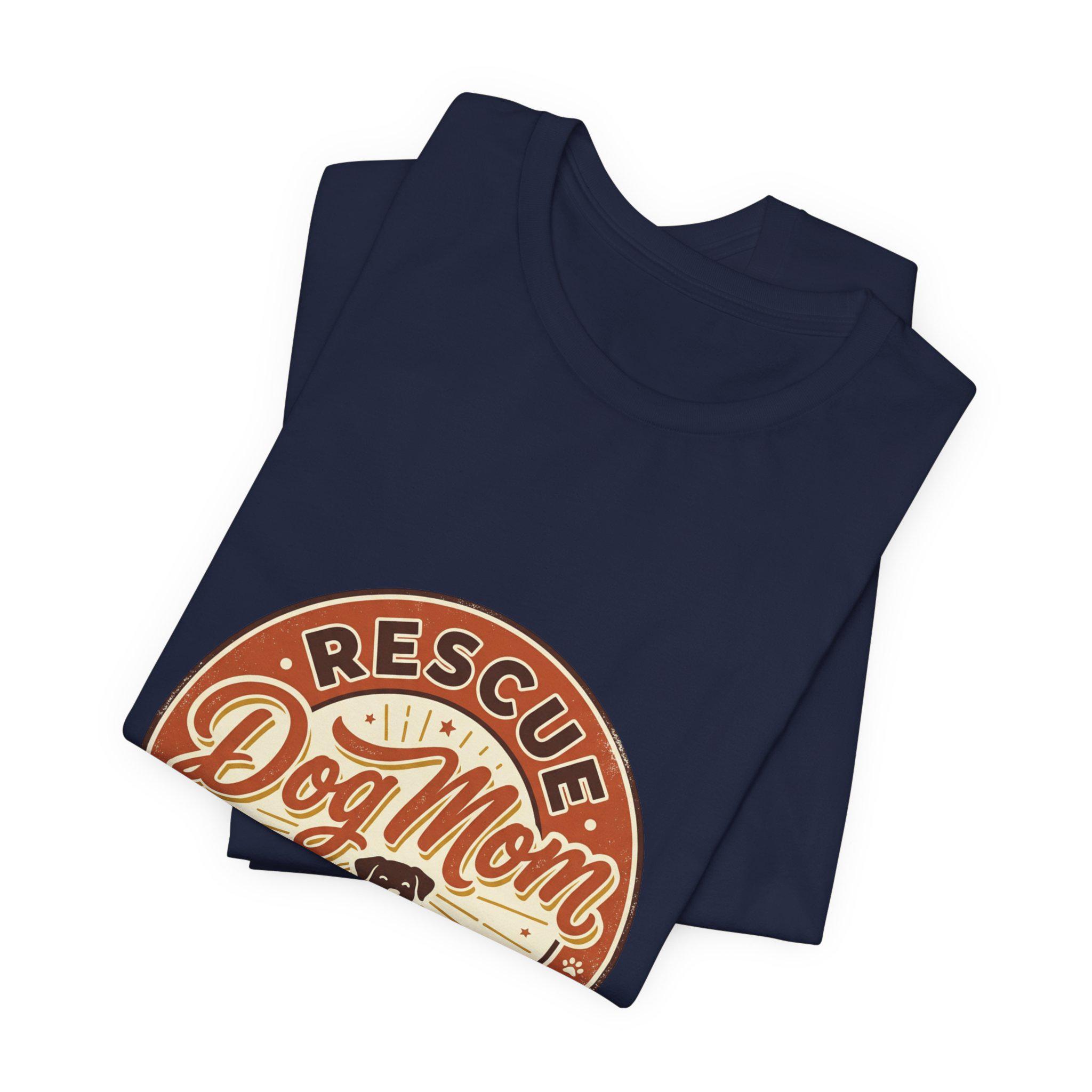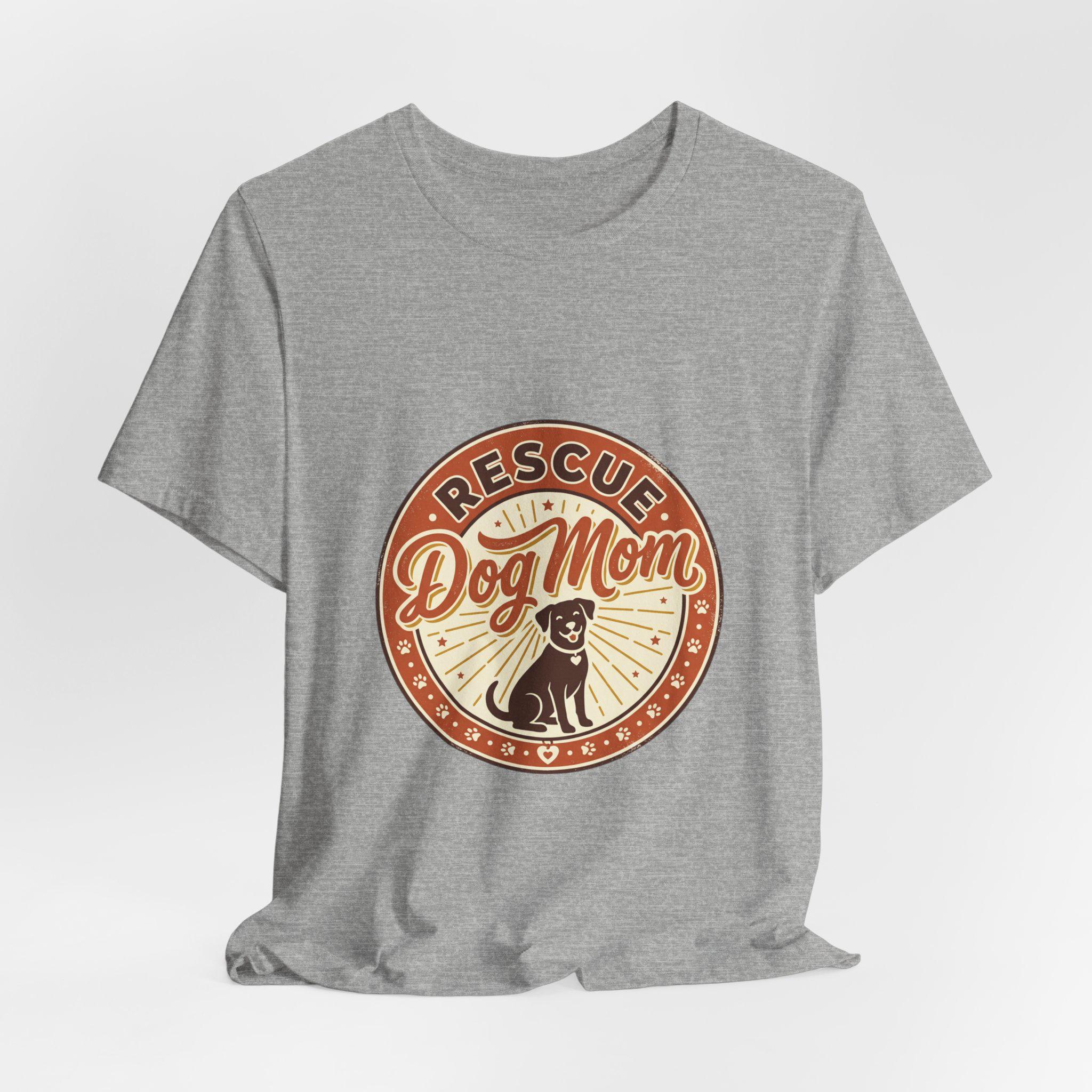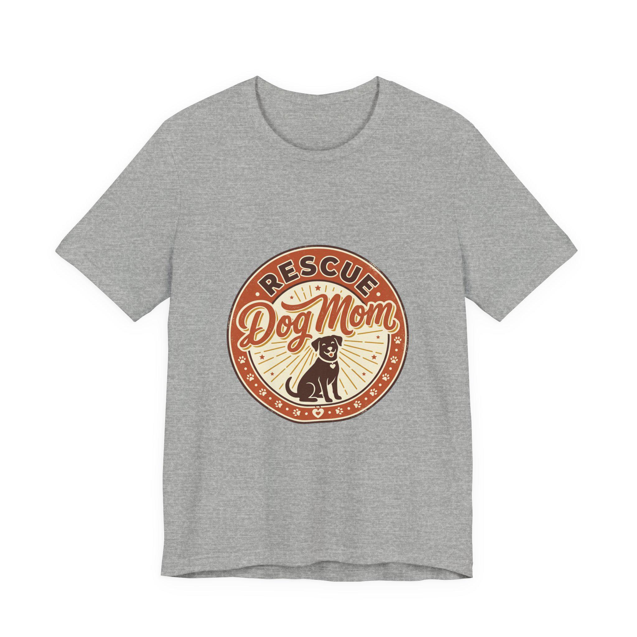 Rescue Dog Mom tee with a warm vintage badge-style illustration celebrating rescue pride. The front artwork pairs friendly script and a sunburst motif around a silhouette of a happy dog, using soft warm neutrals and a slightly distressed retro look that reads as affectionate and everyday wearable. It leans into the dog-mom identity trend—subtle, specific to rescue pride, and styled for casual layering or easy everyday wear.