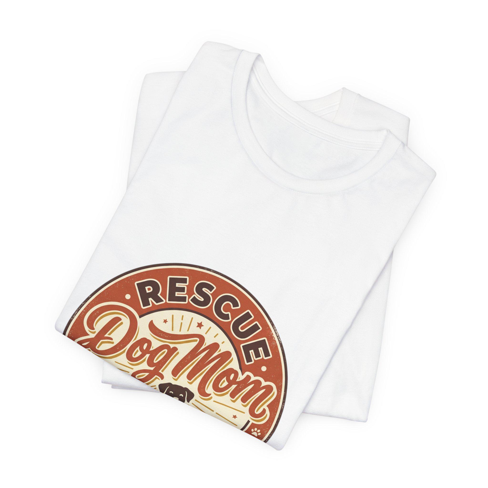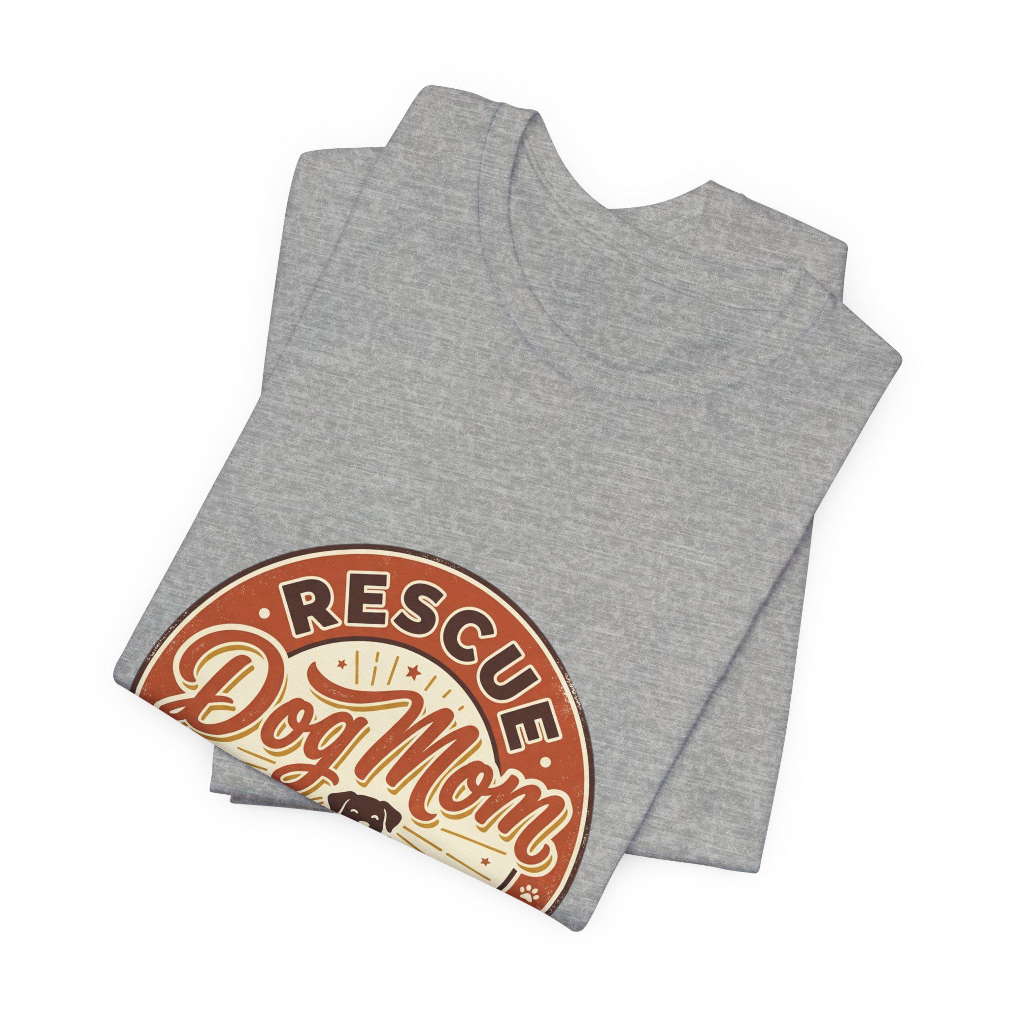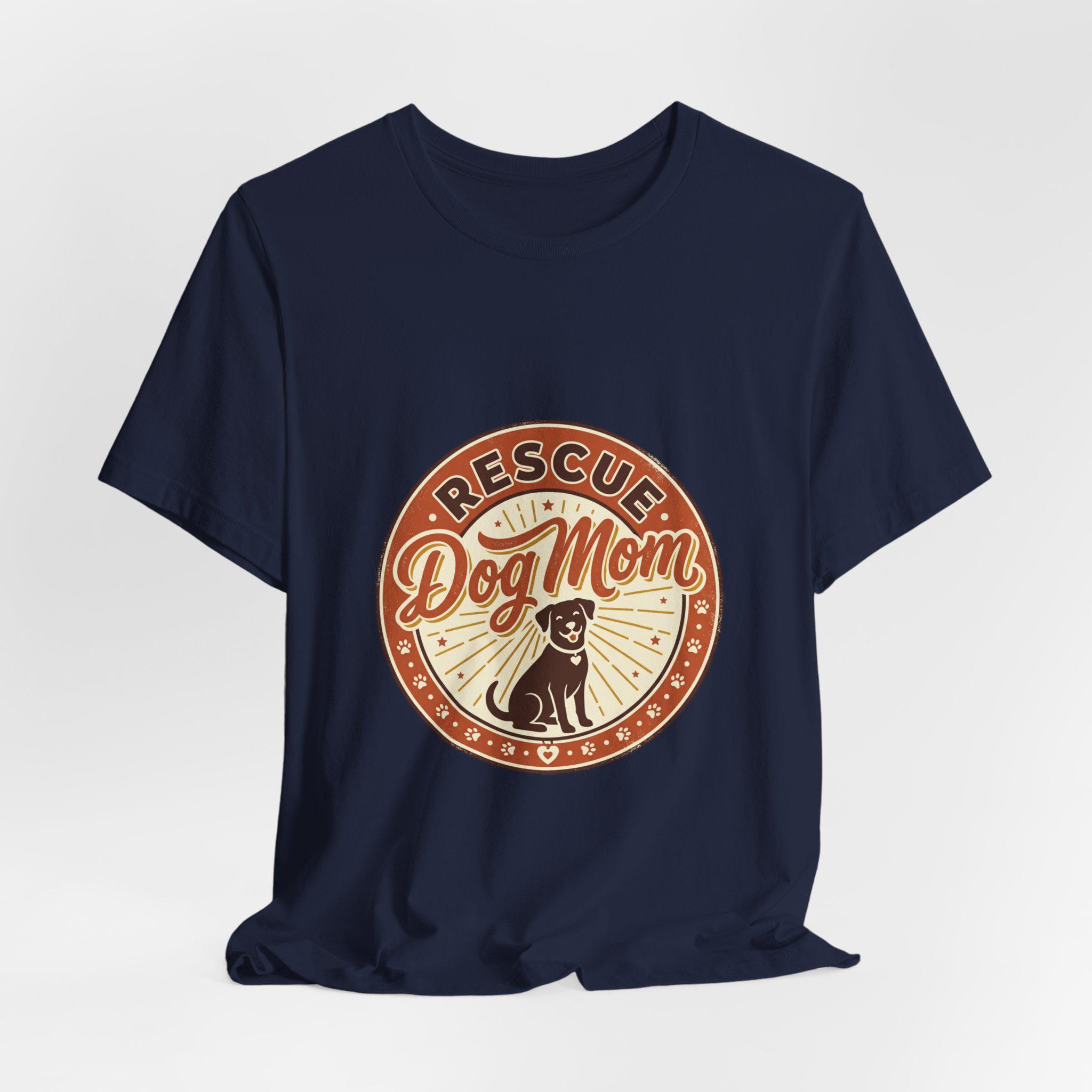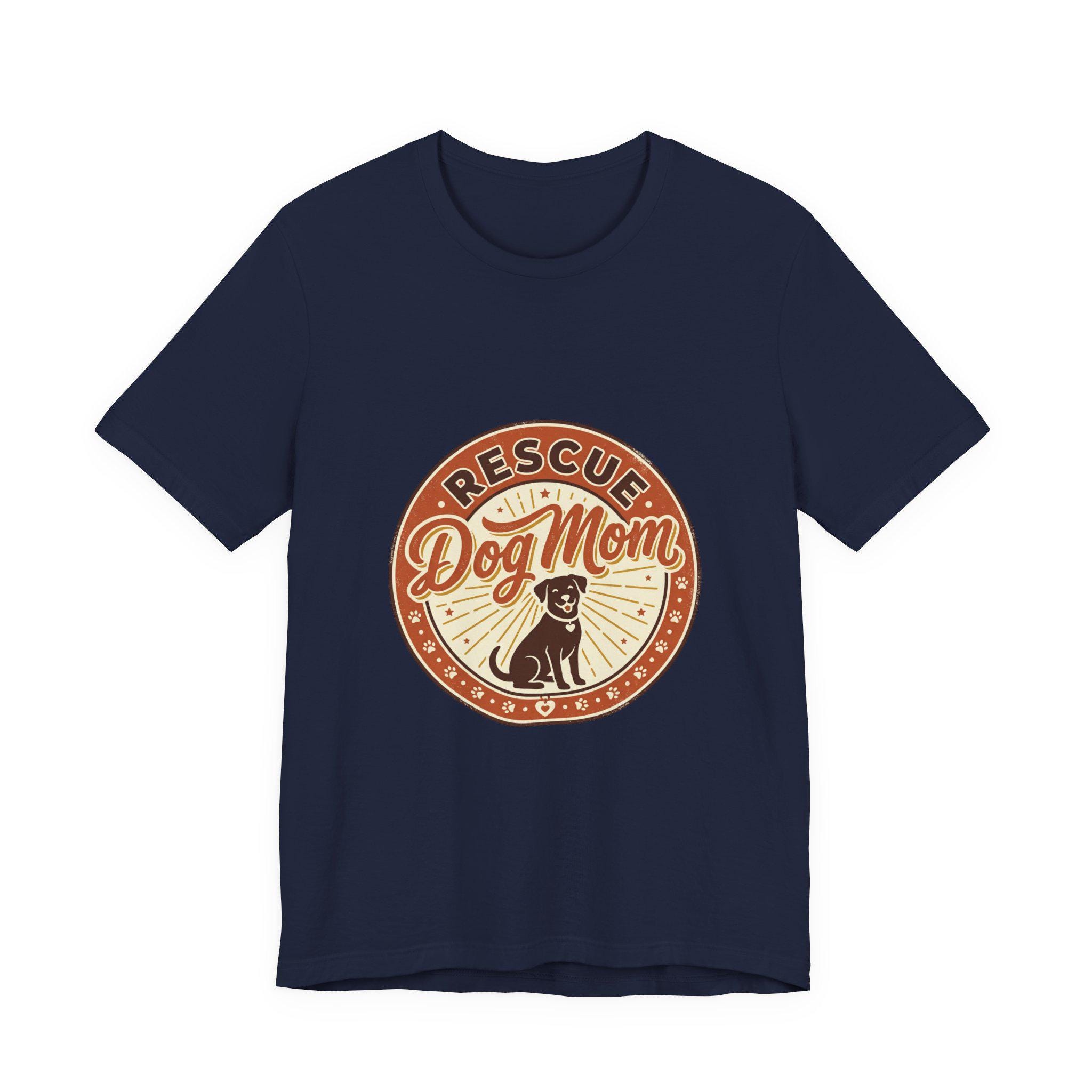 Rescue Dog Mom tee with a warm vintage badge-style illustration celebrating rescue pride. The front artwork pairs friendly script and a sunburst motif around a silhouette of a happy dog, using soft warm neutrals and a slightly distressed retro look that reads as affectionate and everyday wearable. It leans into the dog-mom identity trend—subtle, specific to rescue pride, and styled for casual layering or easy everyday wear.