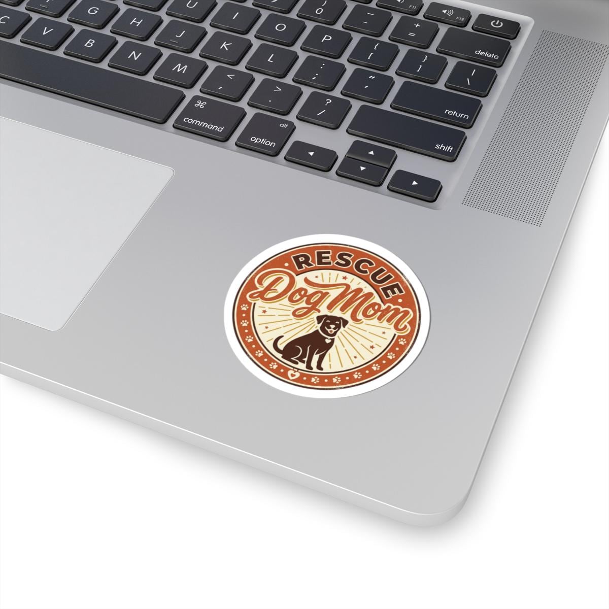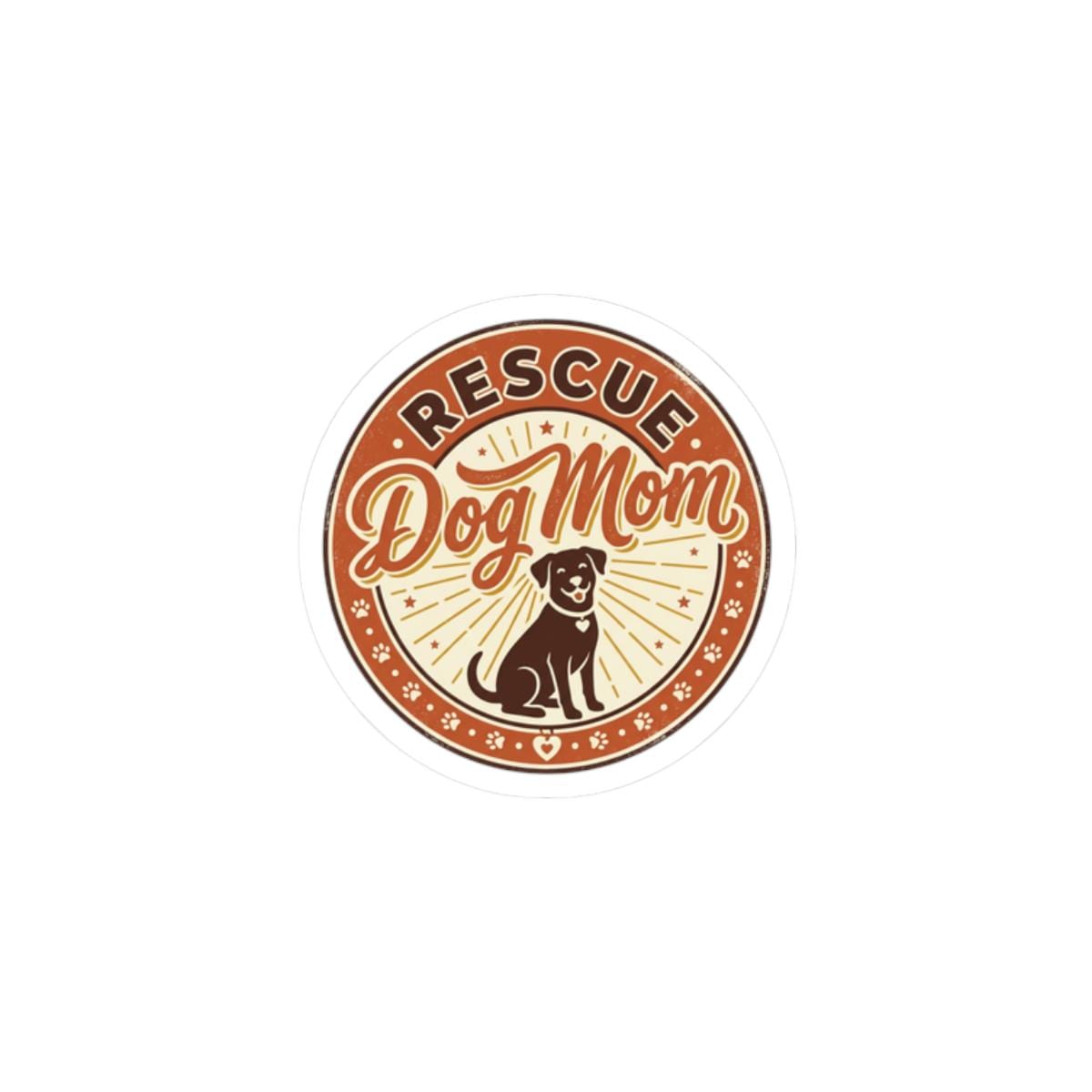 Warm, vintage-inspired circular sticker declaring ‘Rescue Dog Mom’ with a friendly dog silhouette, sunburst rays, and paw-print accents. The earthy rust and cream palette and approachable script echo the pet-parent identity trend—subtle rescue-pride styling for showing loyal connection to a adopted pup on laptops, journals, or water-resistant surfaces used indoors. Designed to read clearly at small sizes and sit naturally in a cozy, nostalgic pet-parent aesthetic.
